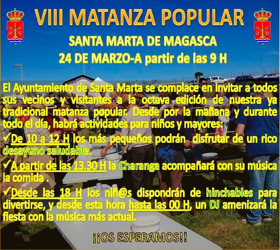 El Ayuntamiento de Santa Marta de Magasca se complace en invitar a todos sus vecinos y visitantes a la VIII Edición de nuestra ya Tradicional Matanza Popular. El día 24 de Marzo a partir de las 9:00 horas, desde por la mañana y durante todo el día habrá actividades para niños y mayores.